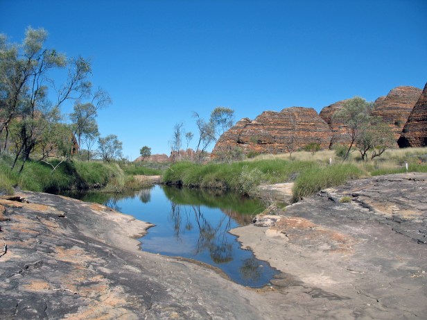 Purnululu National Park är känt för Bungles Bungles – en bergskedja med bikupeformade toppar av randig sandsten som mejslats ut av väder och vind under flera miljoner år. Efter att ha betalat $10 i besöksavgift vid Park Office begav vi oss mot Piccaninny Creek. Vi valde bort den åtta timmar långa hiken, utan tog istället en timmes promenad mot Cathedral Gorge. På vägen dit passerade vi flera små vattendrag. Med den klarblå himlen och de randiga röda bergen som speglade sig i vattnet var det så vackert att man nästan blev gråtfärdig. När vi kom fram till Cathedral Gorge möttes vi av en stor sal inne i berget. Solen sken ner på sjön innanför och fick de röda bergen att lysa. Det var lätt att förstå varifrån ravinen fått sitt namn. Fantastiskt vackert!
