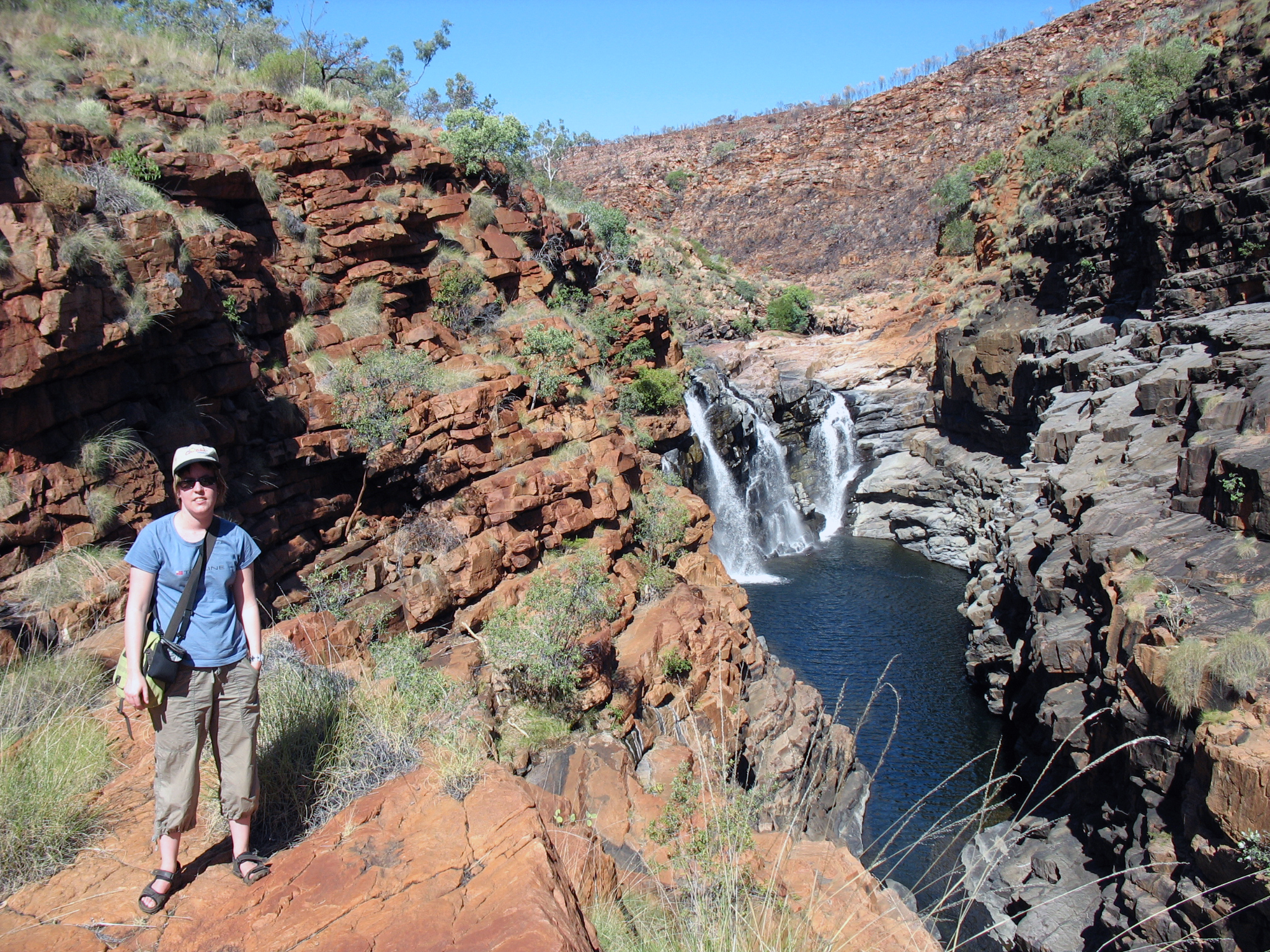 Efter en stund var vi framme vid vägens första ravin – Lennard Gorge. Trots att det var högsäsong i Kimberleys var parkeringsplatsen öde förutom en sandig jeep. Vi fyllde på vattenflaskorna, smörjde in oss med ett extra lager sololja och vandrade sedan iväg över stock och sten. Den lilla stigen slingrade sig upp för en brant slänt med stickigt spinifix-gräs som letade sig in i sandalerna. Solen gassade. Den vackra synen som mötte oss bakom krönet var dock väl värd den heta promenaden. Vattnet låg spegelblankt mellan de vidsträckta röda klipporna och ett vattenfall hördes porla. Otroligt vackert! Dessvärre var värmen lite väl överväldigande för mig så jag fick ta det extremt lugnt på vägen tillbaka. Orkade inte ens bära min kamera. Jag vilade en stund i skuggan av bilen medan vi åt några lunchkex, innan det var dags att köra vidare.