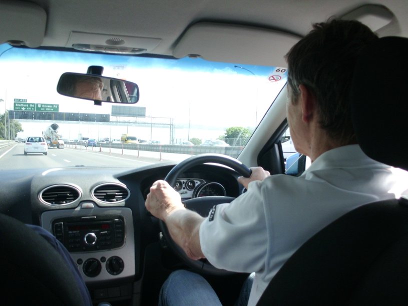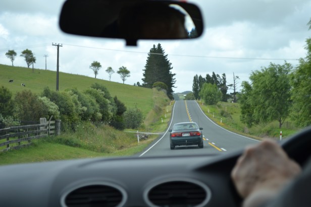 Efter ankomsten till Auckland hyrde vi en automatväxlad Ford Focus. Jag hade önskat en hyrbil med manuell växellåda, men någon sådan fanns tyvärr inte. Eftersom jag inte hade kört med automatlåda på länge, började bilkörningen med några rundor på flygplatsens parkering. Det gick lite knackigt, men efter ett par rundor styrdes ratten mot Aucklands centrum. Under hela flygresan förberedde jag mig mentalt på att köra på vänster sida. Detta påmindes man också om med en liten skylt på instrumentbrädan. Värre var det att hålla koll på körriktningsvisaren och spaken för till vindrutetorkarna, som alltså är på ”fel” sida. Det tog några dagar innan den nya rutinen satt där vid, i god tid, planerade körriktningsförändringar. Däremot hände det till och med sista dagen att jag automatiskt satte på vindrutetorkaren då jag hastigt skulle göra en sväng.