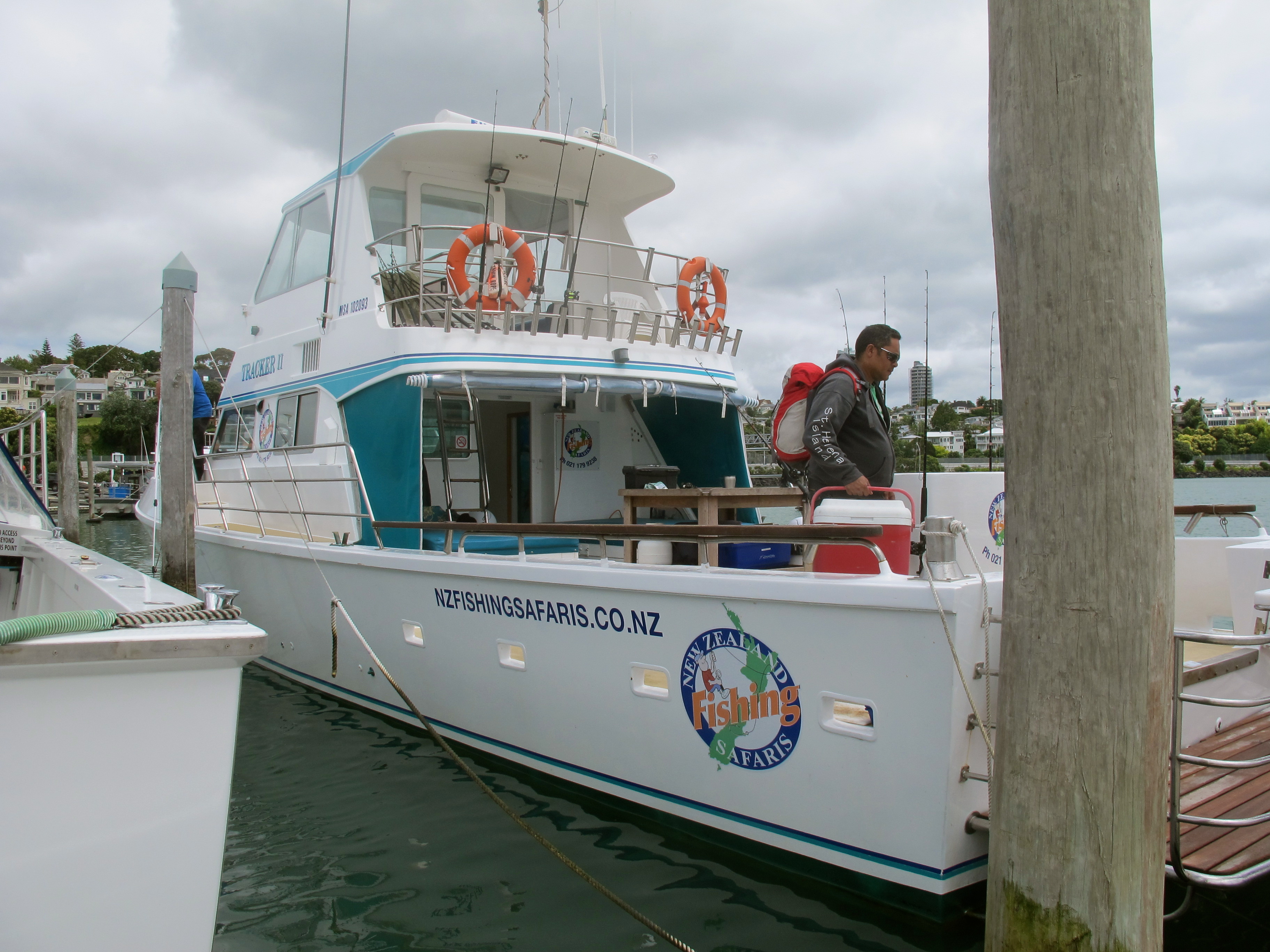 Auckland är välsignad med två kuster och två hamnar inom bara några kilometer från varandra och har därför ett stort utbud av fiskemöjligheter. Hamnen Waitemata och Haurakigolfen är kända för den stora tillgången av snapper men här finns också kingfish och många andra arter. Fisket för dagen är dock snapper. Oavsett om du är nybörjare eller van fiskare är det absolut en upplevelse att åka ut på havet och fiska när du är i Auckland. Det finns olika båtar att välja bland, hel-och halvdagsturer året runt men den bästa månaden är förmodligen februari. Vi väljer en heldagstur på båten MV Tracker som har rum för 15 fiskare och gör kryssningar på 20 knop ut i golfen. Båten är välutrustad med den senaste elektroniken och har alla bekvämligheter för en heldag på havet.