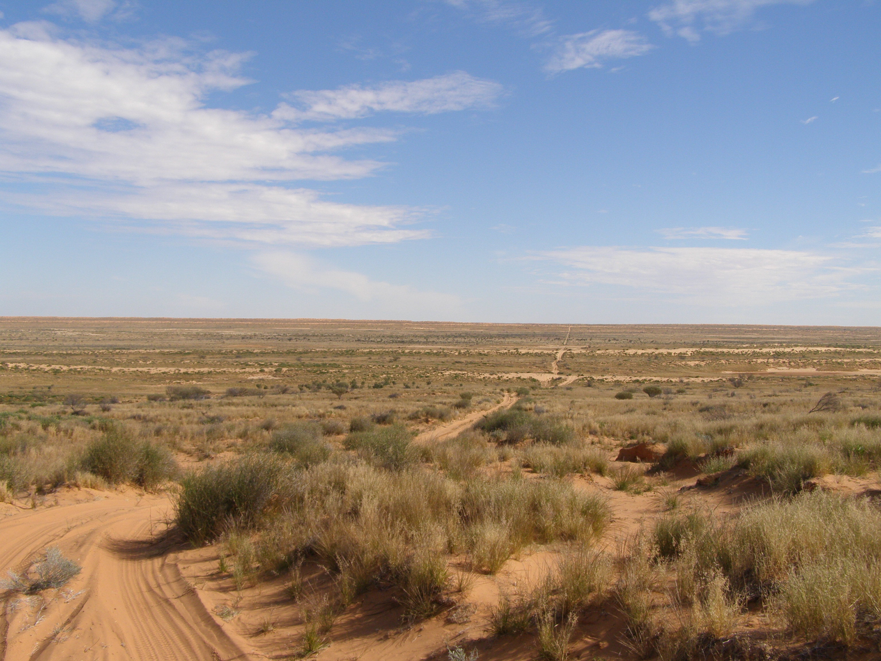 Vi fick köra runt poolen och då grusvägen började bli sandig var dags att stanna och sänka lufttrycket i däcken. Utan problem tog vi oss uppför Big Red och fick se en magnifik utsikt från dess topp. Nu, nu började det! Öknen låg framför oss… Den bredde ut sig som en mjuk matta av sand, gräs och lågväxande buskar och den sträckte sig så långt man kunde se i alla väderstreck… Det var en otrolig syn inte likt någonting jag tidigare sett. ”Vägen”, eller mer sanningsenligt, de två hjulspåren vi skulle följa – ”The French Line”, löpte som ett beigt band rakt väster ut och så började vi vår guppiga resa att korsa Simpson Desert.