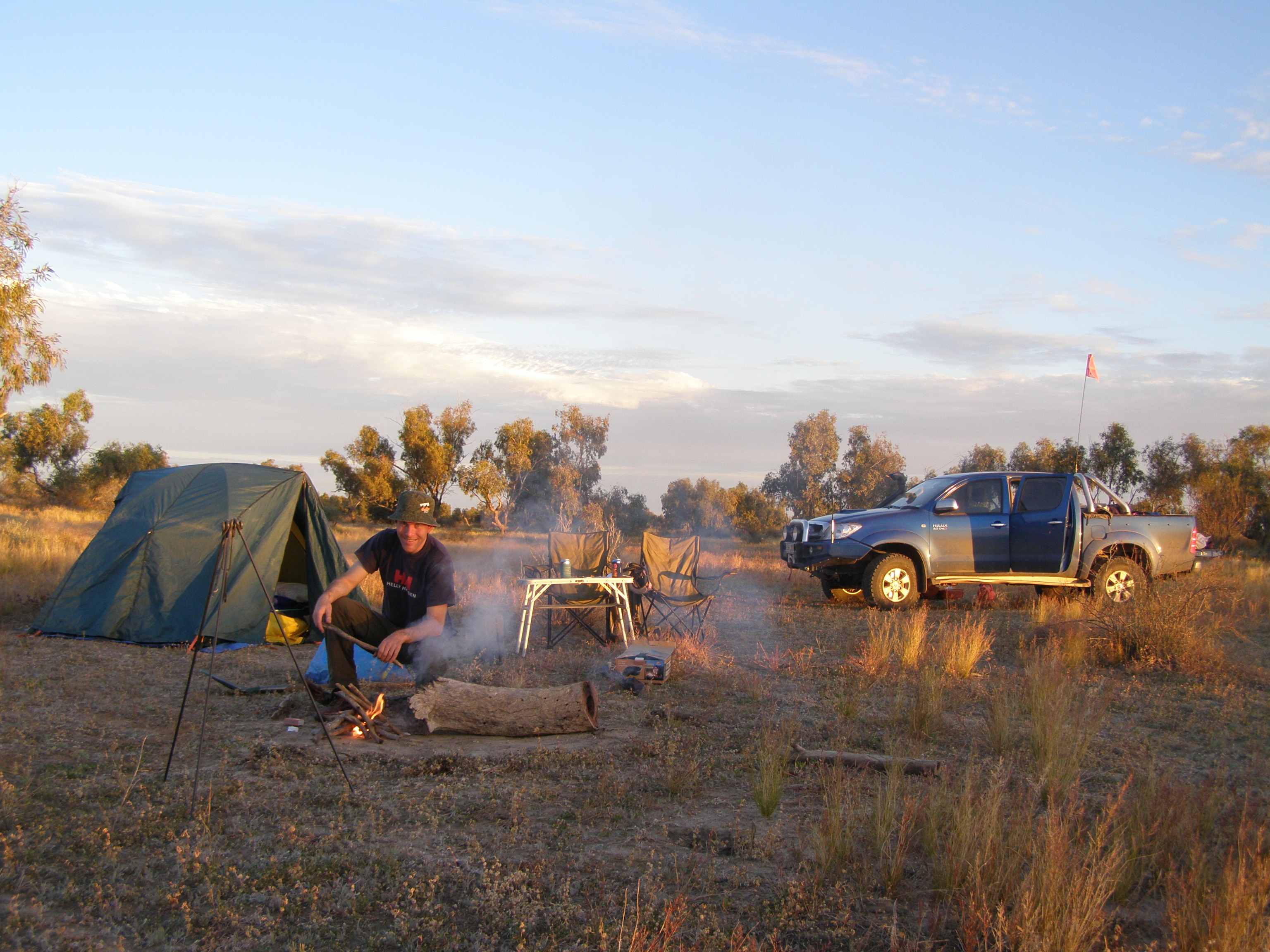 Varje kväll satte vi upp tältet och lagade mat över öppen eld eller på vår lilla gasspis. Torra buskar fanns det gott om, men veden brann som fnöske och vi fick vara snabba med tillagningen. Det var väldigt mysigt att sitta där vid elden och äta medan det sprakade i träet och stjärna efter stjärna tändes i skymningen. Stjärnhimlen vi fick se var helt otrolig och går inte att beskriva med ord, men himlen har aldrig känts större och mer oändlig än där långt ute i vildmarken. Ibland kunde vi höra Boobook-ugglans läte ”boo bok, boo bok” lite avlägset, men annars var det tyst, tyst… Temperaturen sjönk under 10 grader ibland, så fleecetröjan, jackan och mössan användes flitigt och det var skönt att vi hade rejäla sovsäckar.