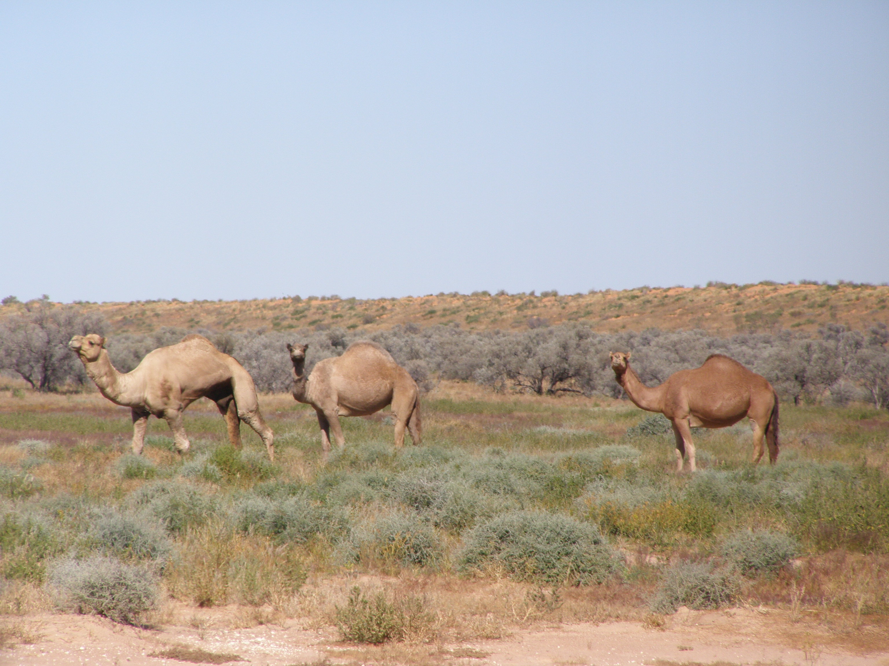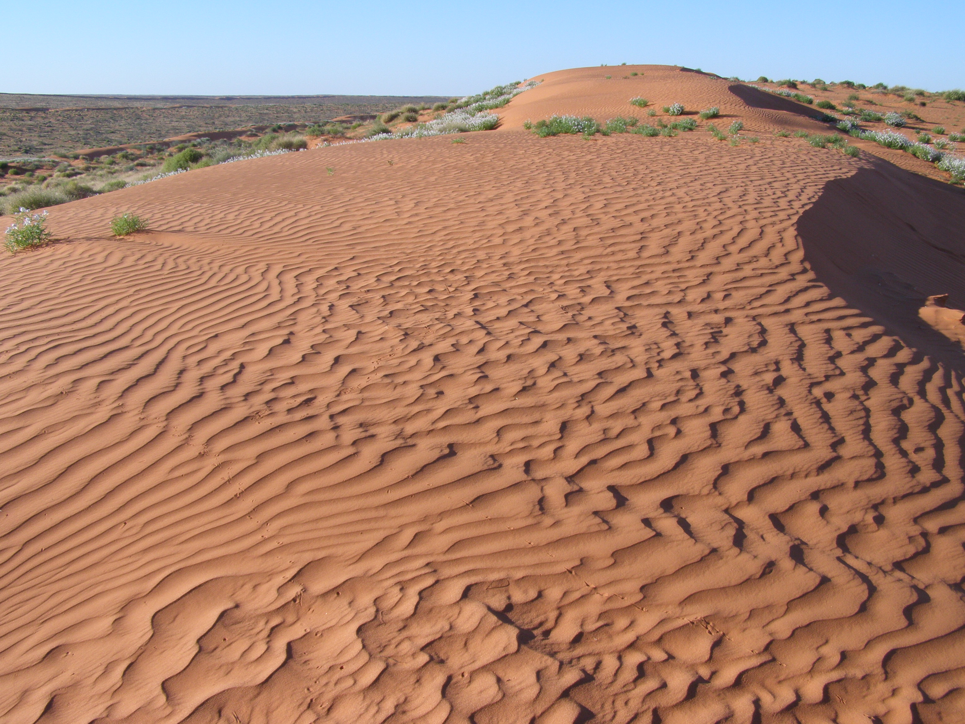 Uppför och nerför, uppför och nerför. I fyra dagar tuffade vi fram genom Simpson Desert i 30 – 40 km/h medan det säregna landskapet sakta passerade utanför fönstret. I vissa dalar såg vi träd och blommande buskar och även mycket fåglar; undulater och olika sorters papegojor satt på vägen eller flög förbi i stora flockar. Allt var väldigt fascinerande, men mest tagen blev jag av att få se vilda dromedarer! (Australien har världens största bestånd av vilda dromedarer). Plötsligt bara stod de där och jag som körde vid tidpunkten blev alldeles till mig, tittade mer på dromedarerna framför oss än på spåren, missade att det svängde och vi hamnade ofrivilligt lite off track… Tur vi hade satellitnavigering och lätt hittade tillbaka. Det såg ju så väldigt lika ut vare sig vi var på eller av vägen!