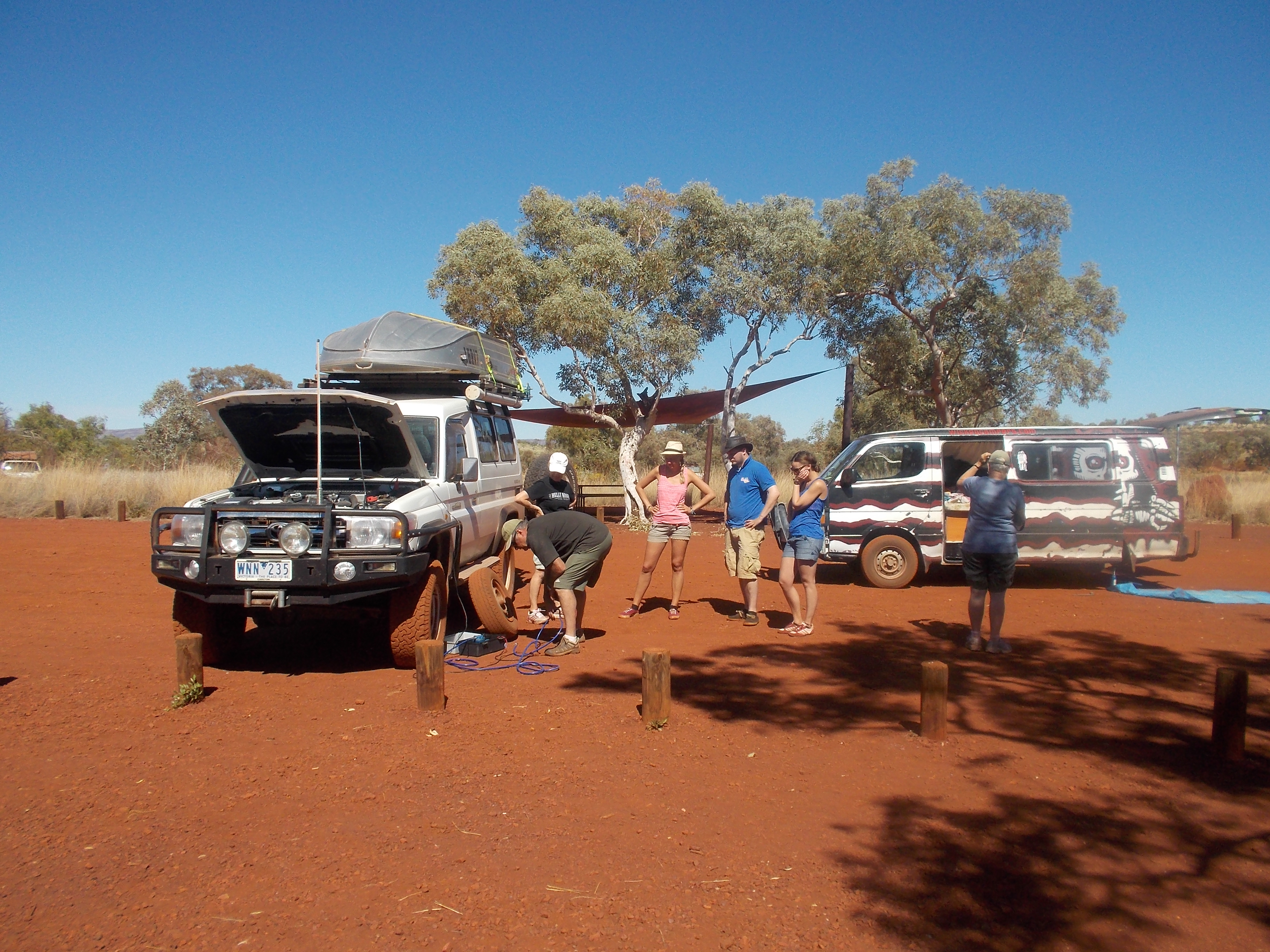 Vår vän Max som varit med länge i ”off road-gamet” kommer till undsättning. En riktig Aussie med en 4W har så klart utrustning för att laga en punktering på plats. Han hjälper de tacksamma tyskarna och vi kan känna oss ganska nöjda med den här dagen. Imorgon ska vi bryta upp och fortsätta mot Port Hedland och kusten igen.