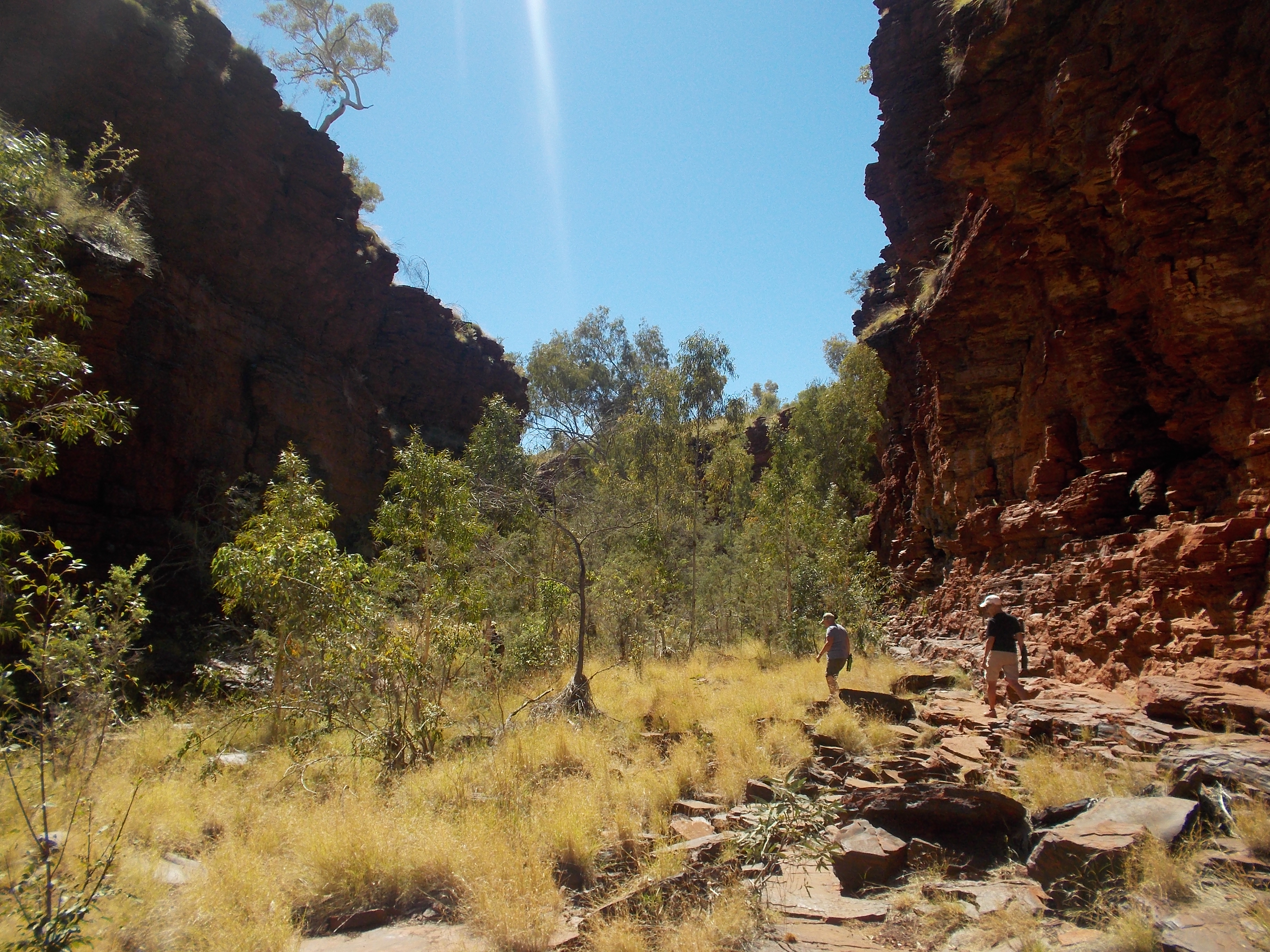 Efter frukost beger vi oss till ravinen eller ”the gorge”. Vi gör en försiktig nedstigning via utstakade leder för att nå botten. Här rinner färskt vatten, det är som att befinna sig i ett sagoland. Längst in i Dales Gorge ligger Fern Pool, en vattensamling stor som en tennisplan. Vattnet rinner sedan vidare i en liten bäck till Circular Pool längre ner i ravinen. Med god balans och bra skor går det att ta sig till botten av ravinen mellan de två. Det är sedan en dryg promenad uppför stigen och tillbaka till lägret.