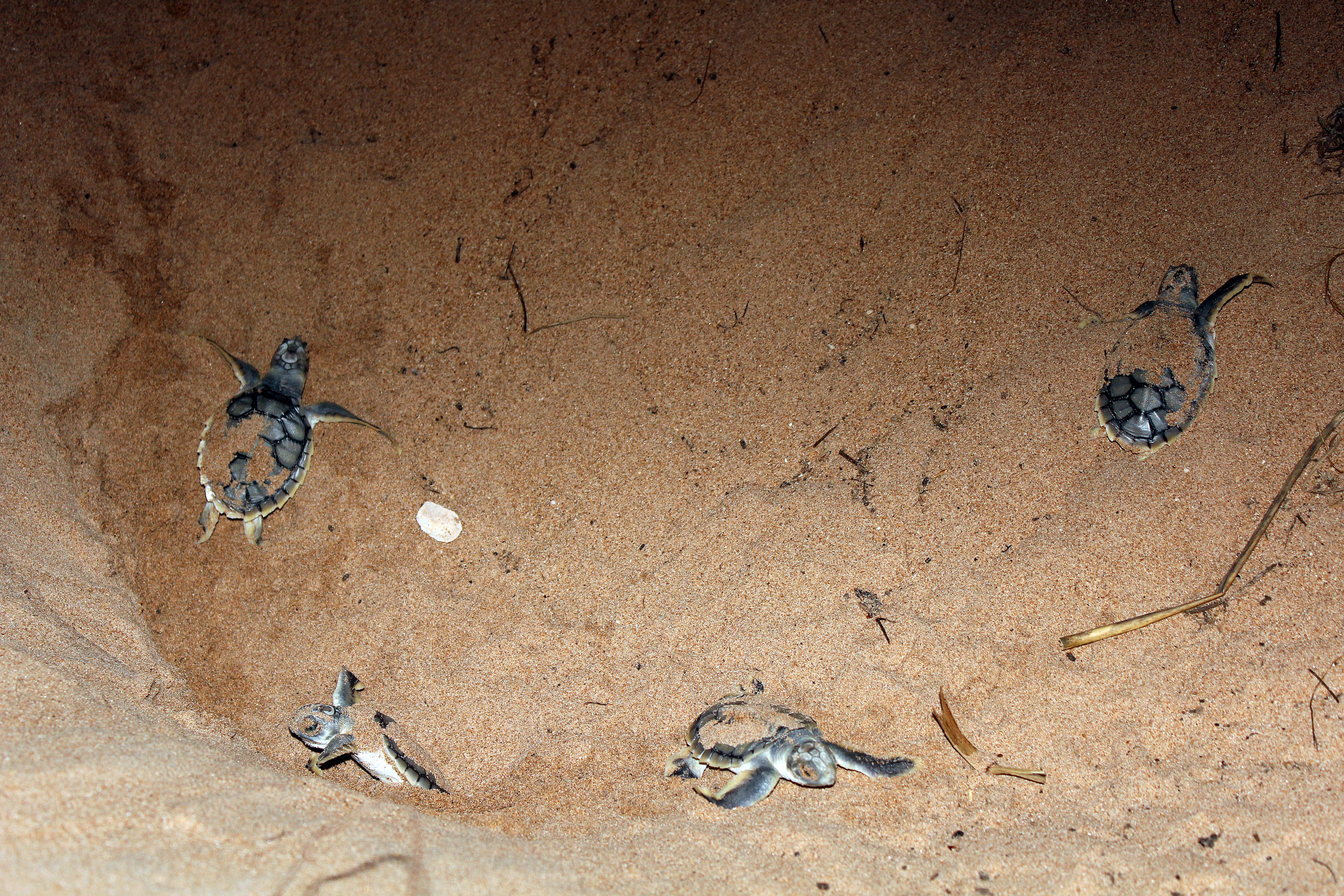 Plötsligt sticker ett litet huvud fram. Och så ett till. De små fenorna rör sig som propellrar och snart har den lilla sköldpaddan grävt sig upp ur gropen. Dess syskon är inte långt efter. För att hjälpa dem på traven lite, och åtminstone undkomma de hungriga måsarna på stranden, stoppar vi ner dem i små bomullspåsar.