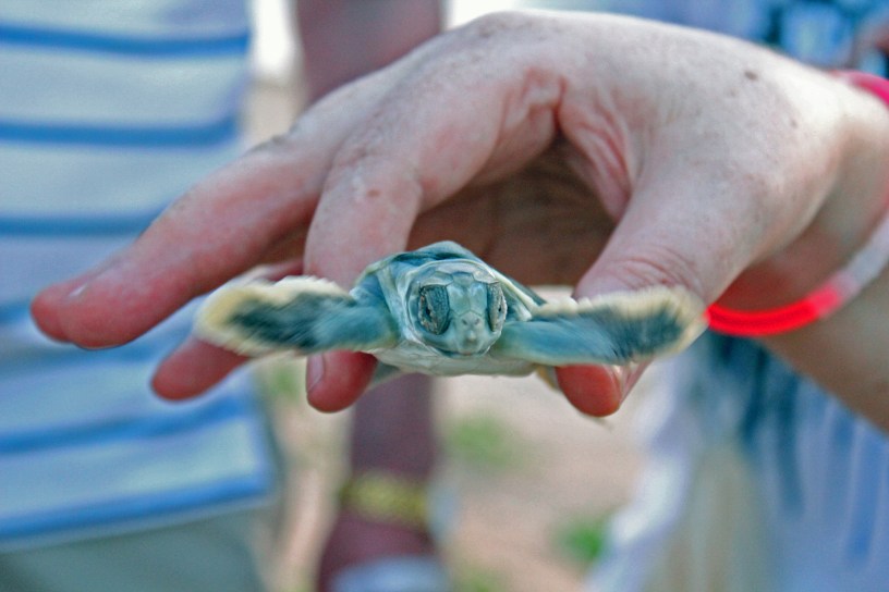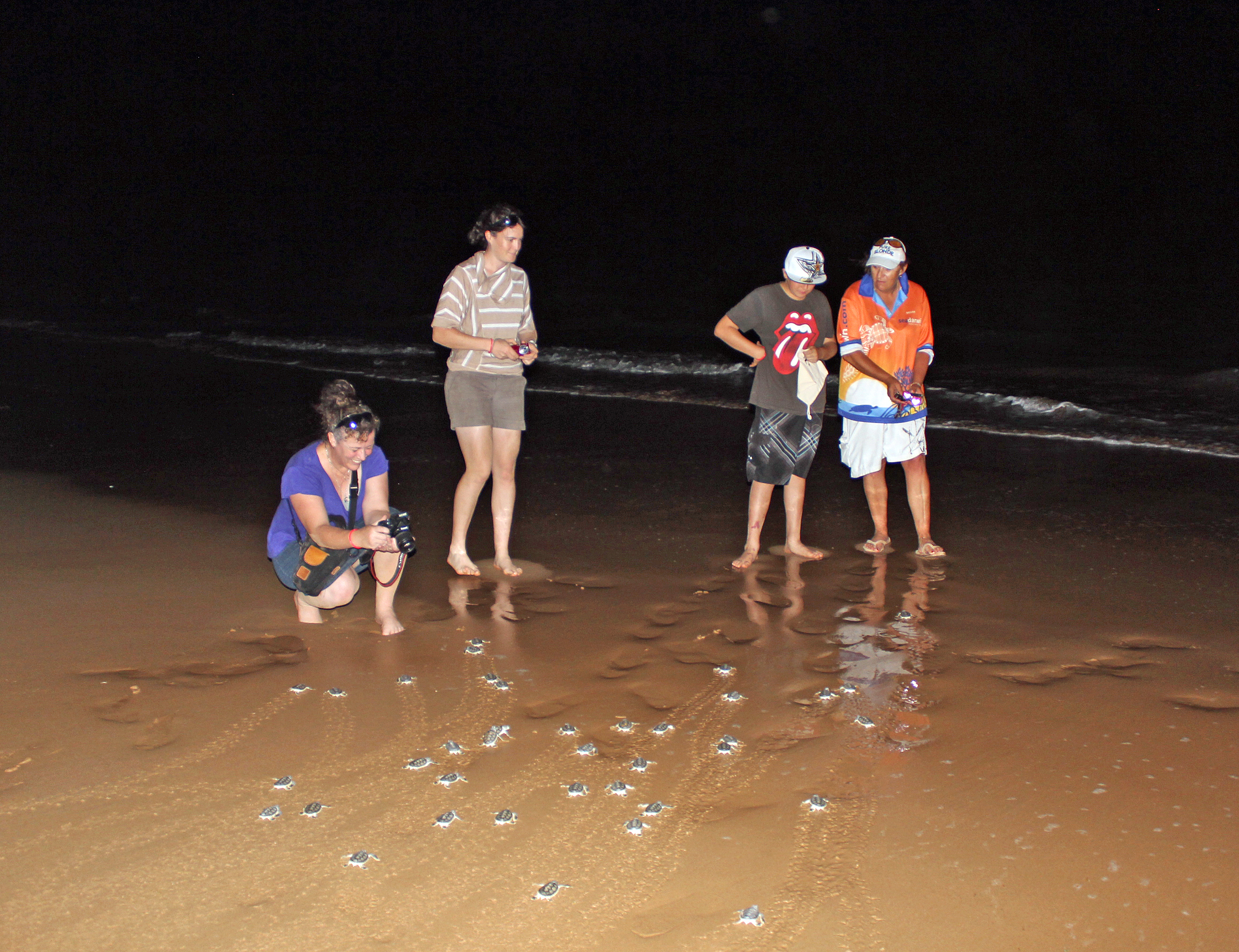 När påsarna är fulla bär vi ner dem i vattenbrynet och låter de små krabaterna kila ut. Det är nu helt mörkt och endast våra ficklampor lyser upp stranden. Sköldpaddorna kravlar sig fram över sanden mot det brusande havet. På sin väg kilar en av dem över min fot och spolas sedan iväg av vågorna ut i det mörka vattnet. Endast en av tvåtusen överlever till vuxen ålder, berättar Megan. Jag hoppas att den lille krabaten som nyss killade min fot är en av de som har tur. Om det är en hona ska den en dag komma tillbaks till stranden och lägga egna ägg.
