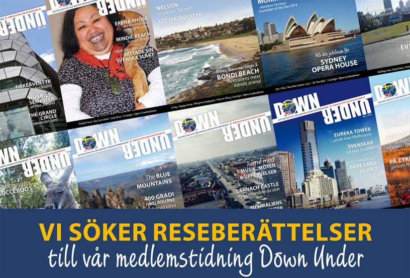 Vi söker reseberättelser till vårat medlemstidning DOWN UNDER. Har du en bra historia, så sänd den till lars@larswallin.nu – gärna tillsammans med dina bästa, relevanta bilder (Högupplösta). Insatta artikler, som publiceras i den tryckta DOWN UNDER ersätts med 500 kr.