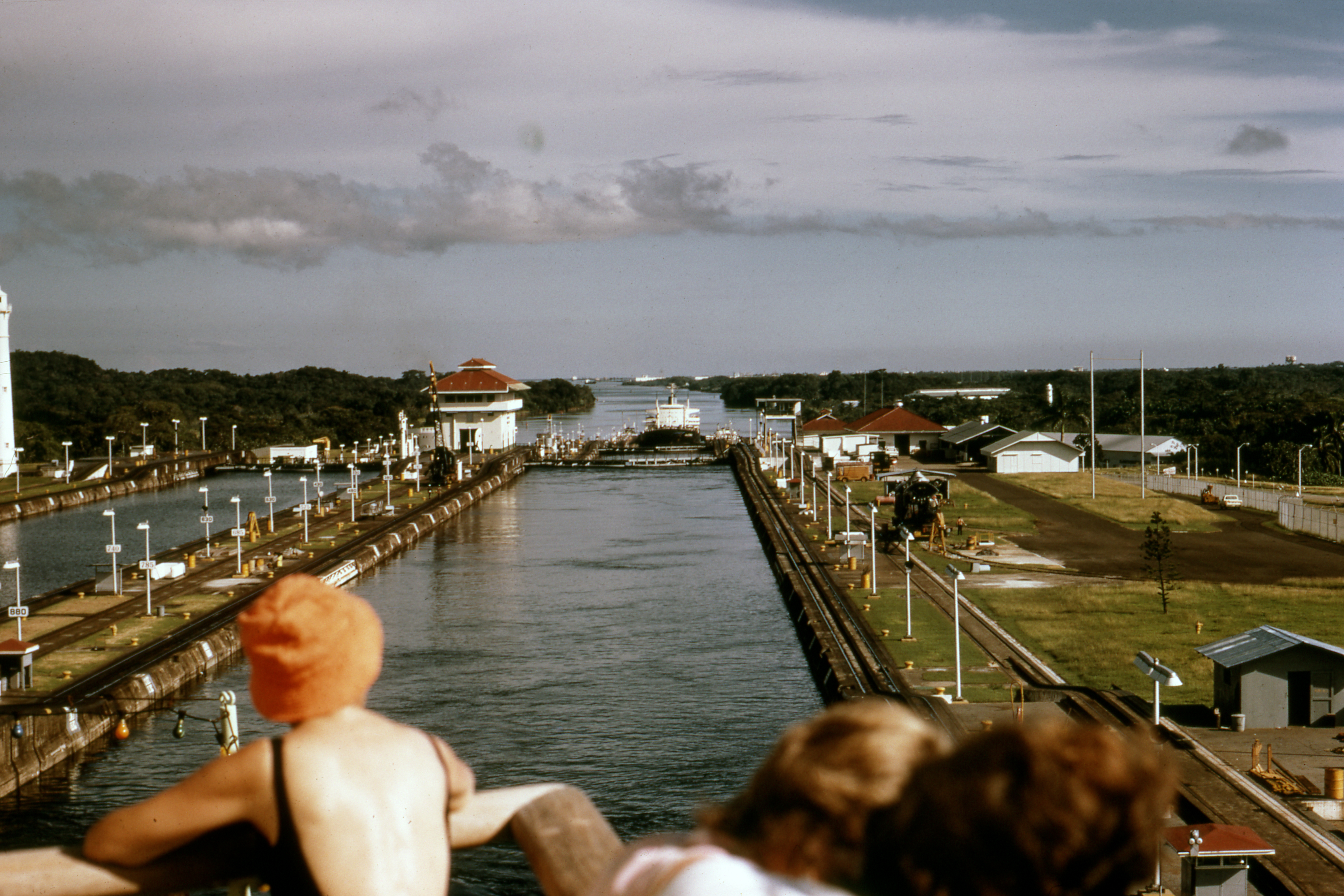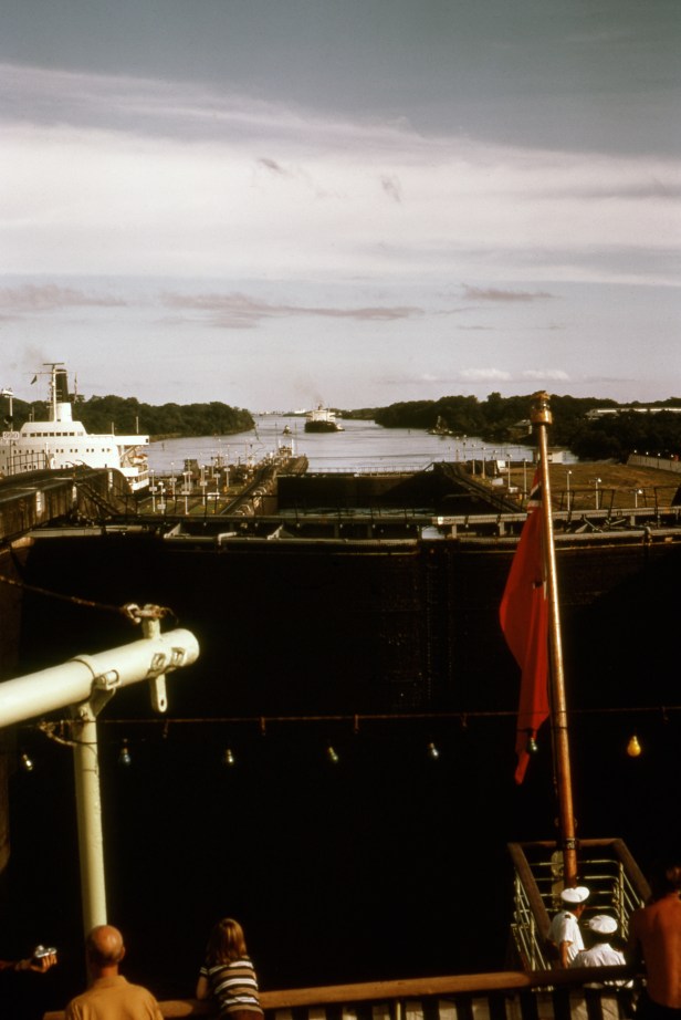 Som av en händelse vaknade jag före fem denna morgon då jag visste att vi skulle närma oss den första slussen. Det var fortfarende mörk när jag kom upp på däck, båten stod stilla och jag kunde se ljuset från Christobal. Jag stod där ensam högst upp och i fören och såg solen gå upp. I och med att det ljusnade började båten sakta, nästan ljudlöst, glida fram i en rätt trång passage med tät vegetation på båda sidor. Jag kunde se rovfåglar, höra fågelkvitter och andra ljud från land. Redan så tidigt var det mycket varmt. Jag minns att jag fick lov att nypa mig själv i armen för att veta att jag inte drömde. Oh, vad jag då önskade att min Pappa hade varit vid min sida då. Jag hade unnat honom att få uppleva detta. Ännu mer blev det så när vi kom fram till första slussen där jag kunde skåda hur det rent tekniskt gick till. Det spändes vajrar mellan vår båt och två lokomotiv i fören och två i aktern.