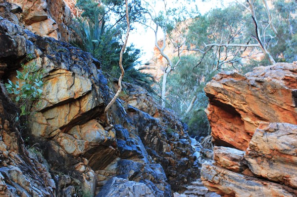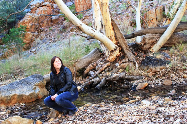 Det blev många tidiga mornar eftersom vi ville se så mycket som möjligt. Dagen därpå blev vi upphämtade klockan sex, för en utflykt på 10,5 timmar. Första stopp blev Simpsons Gap i MacDonnell Ranges, cirka 18 km från Alice Springs. Denna, liksom många andra platser vi fick se, är en viktig och spirituell plats för den australiensiska ursprungsbefolkningen. Vi såg många träd med brännskador av tidigare bränder. Vi åkte vidare till Angkerle (Standley Chasm), en väldigt vacker naturupplevelse! Det skulle ta en timme att promenera fram och tillbaka, men jag och mamma var så fascinerade så vi stannade till överallt och fotade, så de andra fick vänta in oss. Efter lunchen som ingick i priset (som dock bara bestod av mackor, chips och saft) åkte vi till Desert Park. Den var inte lika imponerande som Angkerle, och jag var ganska trött i benen. Höjdpunkten var när vi fick ta del av hur aboriginerna lever i The Outback och vad som går att äta i naturen, och prova på att krossa nötter och göra till mjöl.
