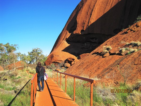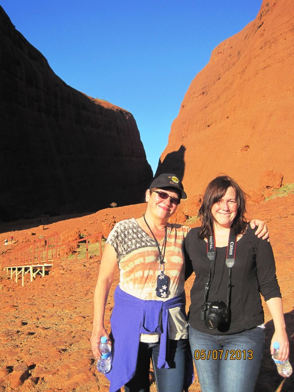 Dagen efter var det äntligen dags att besöka Uluru (Ayers Rock), dit vi åkte buss från Alice Springs. På vägen stannade vi till på en kamelfarm där mamma passade på att ta en kort kameltur och se en dingo på nära håll. Vi stannade även till vid Kata Tjuta, och fick en skymt av Atila (Mount Connor) som både jag och många andra med mig först trodde var Uluru. Dagen avslutades med en solnedgångstur med utsikt över just Uluru, med vin och snacks som sällskap. Uluru skiftar färg lite beroende på om solen skiner eller om det regnar. Den karaktäristiska röda sanden skapar en speciell stämning och vi fick båda med oss en del av den i skorna.