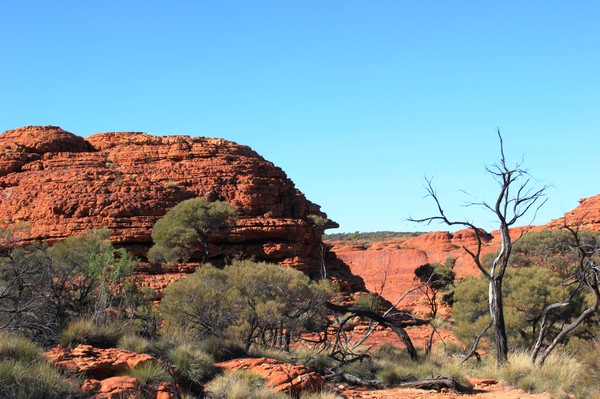Vår semester i Northern Territory tog oss vidare till Kings Canyon redan innan klockan fem på morgonen. Det var dags för en 12,5-timmarsutflykt och oj vad slut jag var i benen efter den dagen! Vi stannade först till för frukost innan vi nådde det mäktiga berget. Bergsbestigningen började med en 500 meter brant backe uppåt, och jag önskade verkligen att jag vore i lite bättre form. Det tog ungefär tre timmar att se det mesta uppe på berget, men återigen hamnade jag och mamma på efterkälken eftersom det var så mycket att fota med den vackra utsikten över Watarrka National Park. Ett tag var jag faktiskt lite rädd att vi blivit kvarglömda när jag inte såg resten av gänget. På vår biljett stod det att det kan bli upp till 36 grader varmt på sommaren och då rekommenderas man att inte klättra upp för berget. Jag kunde förstå hur lätt man skulle kunna gå vilse, speciellt om man är uttorkad och trött av värmen, så denna utflykt lämpar sig förmodligen bäst just under senhöst eller vinter. Oavsett årstid så är välfyllda vattenflaskor och en keps som skyddar huvudet från solen ett måste. Vi åt lunch längs med vägen tillbaka, och när vi var tillbaka på Outback Pioneer Hotel provade mamma på att äta en känguruhamburgare som hon tyckte var supergod.