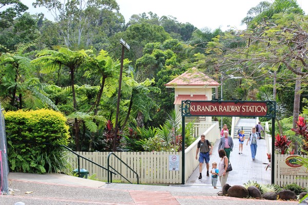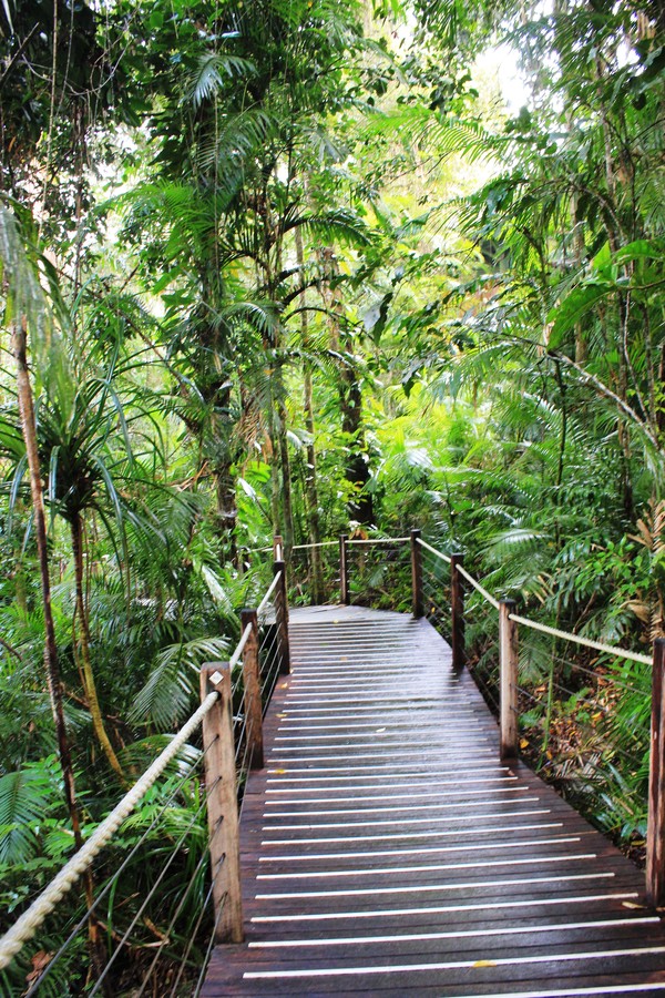 Efter vår promenad runt Uluru checkade vi ut och tog flyget till Cairns, för vidare färd med transfer till Port Douglas cirka 1,5 timme därifrån. Vilken tropisk hetta som mötte oss där i Norra Queensland, trots att det ändå var mitt i vintern! Jag blev lite åksjuk av alla slingriga vägar, chauffören körde ganska fort. Det var lite klurigt att få tag i nyckeln till vårt rum på The Pavilions eftersom vi kom fram på kvällen och det redan var mörkt, men till slut hittade vi den i en brevlåda. Väl framme väntade det finaste hotellrum jag någonsin bott i, långt upp med vackra palmer precis utanför balkongen. Eller ja, snarare lägenhet! Jacuzzi, stort vardagsrum som var delat med en kökshörna, stor balkong och en skön säng. Dock gillade även en massa små myror att hänga i lägenheten. Efter en skön sömn vaknade vi tidigt, och det var dags för att åka till Kuranda, en väldigt mysig by vid den vackra regnskogen. För att ta oss dit åkte vi Skyrail Rainforest Cableway; en linbana som först går över regnskogen, och som stannar till längs med vägen där man kan hoppa av, för att slutligen stanna i Kuranda. Förutom att njuta av god mat och lite shopping kikade vi in i ett fjärilshus fullt av vackra fjärilar. Vi fick berättat för oss att fjärilarna gärna dras till färgglada kläder då de tror att det är mat, och trots att jag hade ett vitt linne satte sig en fjäril på mig också. Dagen i Kuranda avslutades med att vi hoppade på ett tåg, Kuranda Scenic Rail, som sakta körde runt med magnifik utsikt över regnskogen. En guidad röst i högtalarna berättade om allt vi såg, varvat med historiska fakta. Tillbaka i Port Douglas promenerade vi runt i den fina lilla staden som även kallats motsvarigheten till franska rivieran. Klart bästa dagen på resan, tillsammans med vandringen runt Uluru.