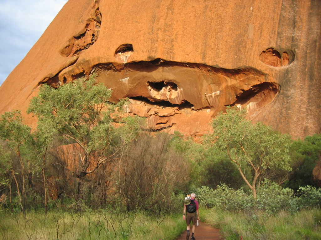 Nästa dag färdades vi med buss cirka 46 mil rak väg till Ayers Rock Resort. Jag kunde i stort sett bara räkna till två svängar på vägen dit. Att sedan med egna ögon se de mäktiga bergen/stenarna Kata Tjuta och Uluru (Ayers rock) mitt ute i den röda ödemarken var häftigt. Att vid både kvälls- och morgonturen till Ayers rock få avnjuta en buffé är förstås också en minnesvärd upplevelse. Värmen inbjöd dock inte till några längre vandringar i området, men Half Base walk på ca 4,5 km klarade vi av och fick en liten inblick i varför denna jättemonolit är helig för aboriginerna. Klättra upp på den fick man inte längre. Det var dock tillåtet när min man var där 1986.