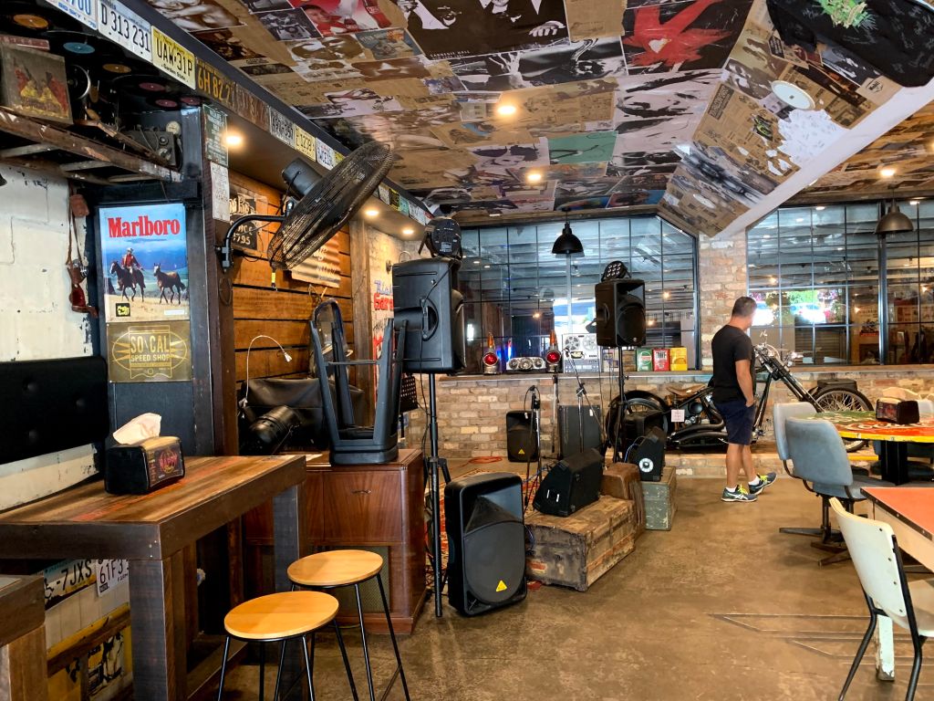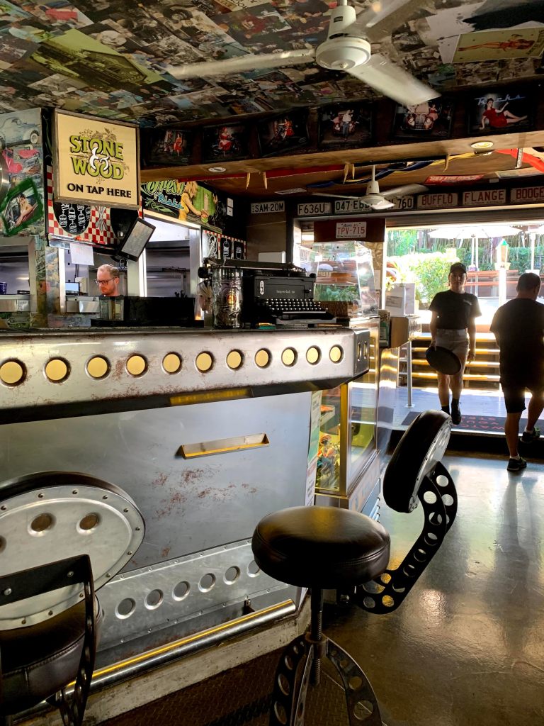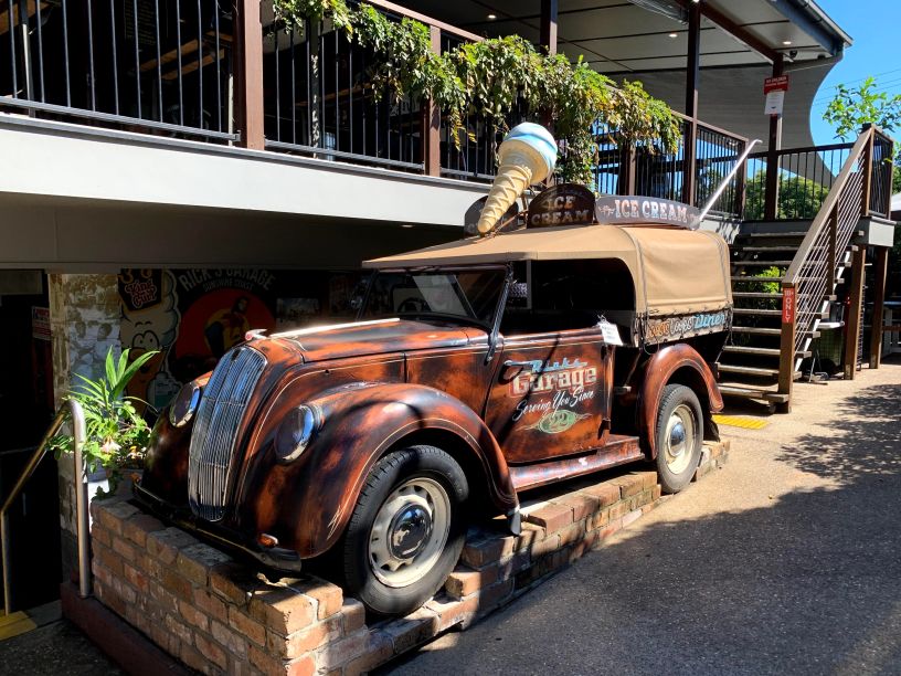 Vi kör vidare och är snart framme i den mindre byn Monteville, där många små butiker och caféer sträcker sig ut över bergskedjans stupande kant för att fånga utsikten och där dagens första turister precis parkerat och nu jagar förmiddagens första fika. Här svänger vi dock ner för den branta bergskanten och följer vägen som slingrar sig igenom den tjocka regnskogsgrönskan för att komma fram till den lilla byn Palmswood längs ner. Där sprider sig på nytt små farmer med ananasplantager, jordgubbsodlingar och gröna ängar ut sig tills vi når vårt första mål för dagen och parkerar framför Rick’s Garage (www.ricksgarage.com.au). Vi är visst inte de enda som har kommit ett par minuter tidigt innan öppningsdags och vi får snart så i kö – på en helt vanlig tisdag! Mitt ute i ingenstans! Det bådar ju gott och visst har den gamla bilverkstaden fått ett helt nytt liv nu som en gammal amerikans diner. Väl inne finner vi hela stället fyllt av gammal memoribilia av alla de slag från 50 och 60 talet. Här finns bland annat ett flertal motorcyklar varav en Harley Davidson från 1910 talet med drivbältet synligt längst med vänstra sidan som stod uppställd under trappan. För dom som gillar motorcyklar i allmänhet är det tydligen roligast av allt att köra på långa kurviga vägar där de kan flytta kroppsvikten från en sida sadeln till den andra i kurvorna, och här runt Palmwoods är det gott om den varan vilket säkert har medverkat till att den gamla bilverkstaden nu har blivit ett så populärt ställe för både motorcykelentusiaster och gamla bilfanatiker. Och har man turen att komma hit på en helg så är tydligen parkeringen utanför och längst med gatan smockfull av stolta ägare av kromade fordon som kommit dit för att glänsa en stund.