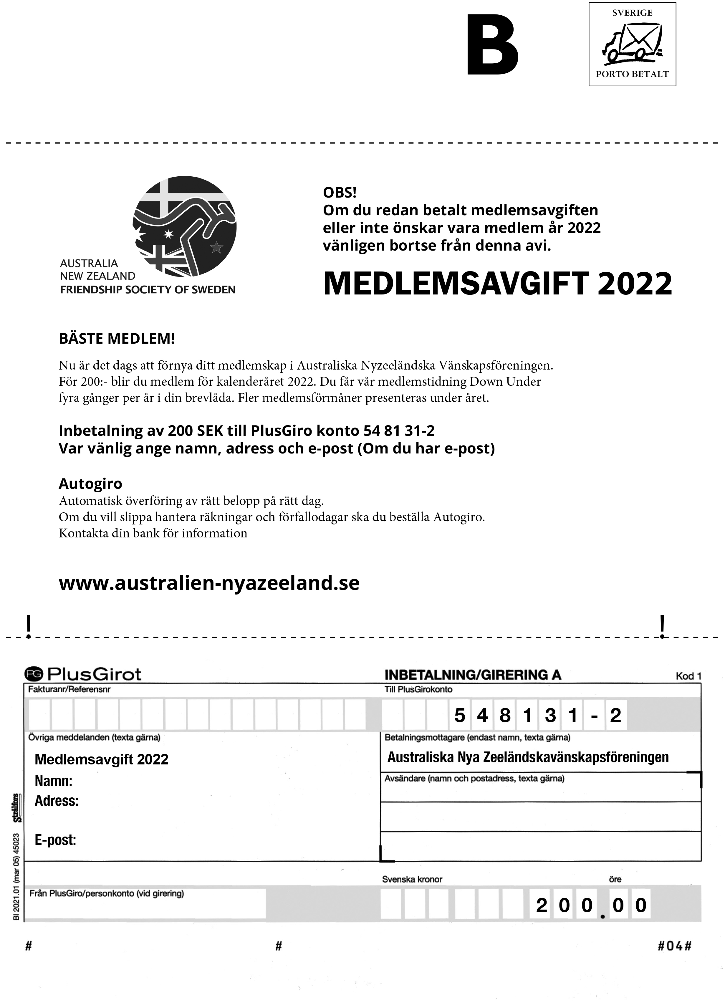 Medlemsförmåner Bli medlem 2022 inkl prenumeration av fyra nummer av medlemstidningen Down Under för 200 kr. Datum: september 30, 2021Författare: Australiska Nyzeeländska Vänskapsföreningen 0 Kommentarer Bli medlem 2022 inkl prenumeration av fyra nummer av medlemstidningen Down Under för 200 kr. Betalar du nu ingår medlemskap för resterande del av 2021 + hela kalenderåret 2022. Inbetalning till PlusGiro konto 54 81 31-2. Ange namn och adress. Dela detta: Klicka för att dela på Facebook (Öppnas i ett nytt fönster) Facebook Klicka för att dela på X (Öppnas i ett nytt fönster) X Klicka för att e-posta en länk till en vän (Öppnas i ett nytt fönster) E-post Klicka för utskrift (Öppnas i ett nytt fönster) Skriv ut Gilla Laddar in … Relaterade