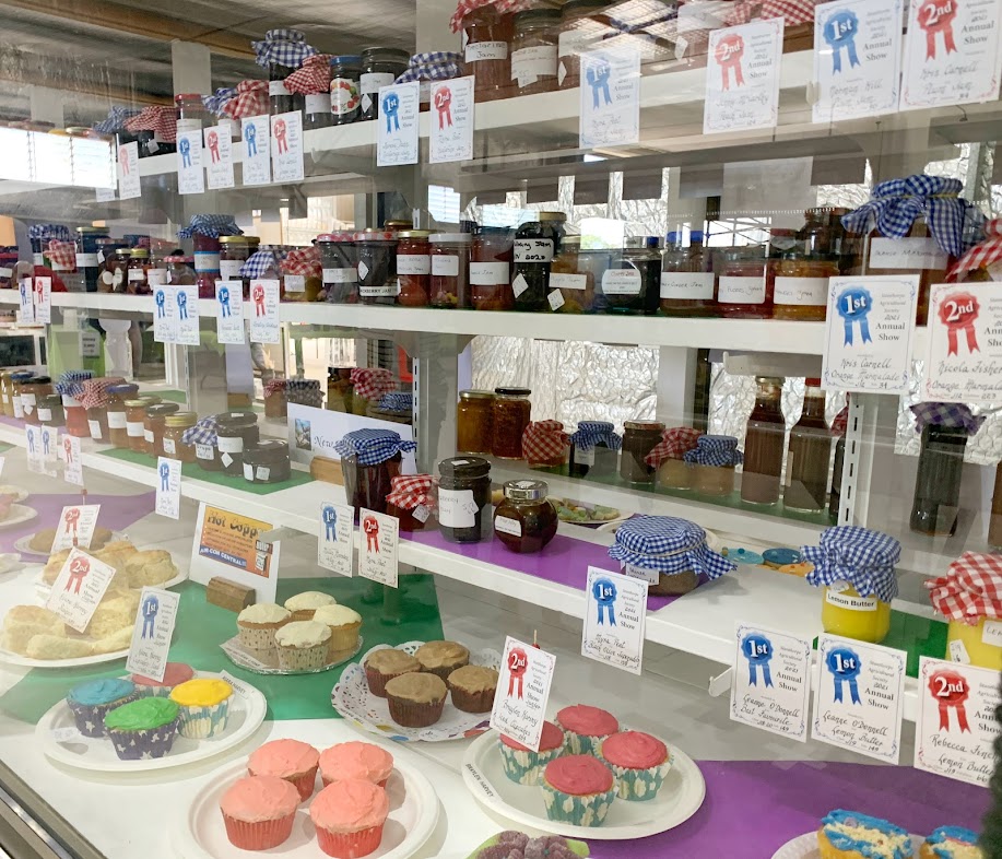 Jag bestämmer mig för att kolla läget inne i hangaren där alla möjliga och omöjliga tävlingar pågår. På ett par långa bord står en massa vinflaskor fyllda med vackra dahlior och rosor. På ett annat ställe har alla bakverken blivit placerade. Här finns allt från lågstadieelevernas bakverk till de vuxnas. Naturligtvis finns där de klassiska scones och hemlagad marmelad, Anzac småkakor men även sockerkakor med eller utan glasyr och givetvis det australiensiska brödet damper som ofta bakades förr över en öppen lägereld.