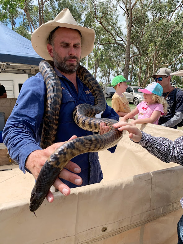 I stället besökte jag bara marknaden tidigt den sista dagen för att möjligtvis få lite tips i vad man kan ställa upp i nästa år. Snart hade jag hittat en mindre folksamling runt en inhägnad inlindad i presenningar. I mitten stod en man i en sliten hatt omringad av ett antal blå boxar och trälådor. I ena handen hade han en tunn stav med en krok och från den hängde det en orm som han stolt visade upp medan han informerade folksamlingen om ormens olika egenskaper. Emellanåt hängde publiken längst fram runt relingen lite väl mycket över inhägnaden och han var tvungen att be dem att backa lite. Själv hade jag bara ett par veckor tidigare blivit upplysts av en granne att hon hittat en Eastern Brown-orm i sin blomsterrabatt och att en annan granne hade hittat en någon dag innan dess i sin trädgård. En Eastern Brown-orm är den näst giftigaste ormen i Australien så visst var jag så klart lite extra intresserad av att lära mig lite mer om ormar i allmänhet och under hans lilla show fick jag lite mer kött på benen.