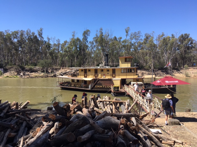 Det var spännande att resa i den röda sandröken som omgav oss i hettan, vindarna och brändernas spår. Tidigare resor även med bil där, har givit het och skiftande väderlek men inte med ett sådant rött dis på himlen. Pausar i full blåst och alla drar sig inomhus för att slippa sanden, trots värmen. Echuca med sina flodångare hägrar för oss. Dem kan man åka med precis som i tv-serien ”Floden blev mitt liv” som spelades in i trakten. I staden innan Echuca laddar himlen ur med ett rejält åskväder som resulterar i ett stort strömavbrott. Det får vi veta när vi anländer till vårt motel i Echuca, för då kommer hästfolk och vill checka in pga strömavbrottet i den stad vi passerat. Vi tar ett svalkande dopp i motellets sköna pool, nästan ett måste i hettan.