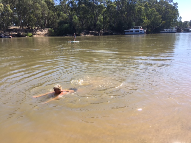 Den verkar väldigt populärt för där är gott om folk. Plötsligt glider en hund förbi på en ”bräda”, husse glider bredvid på en egen bräda med strömmen i floden. Man går till en plats och driver bara med strömmen runt kröken och tar sig upp på den gräsklädda stranden ovanför. En härlig känsla och rolig upplevelse med både hundar och folk som jag ”varmt” kan rekommendera att prova. När vi kört bil förut längs med Murray River har vi fått se både grönska och träd som växer i floden. På vissa platser finns gratis vägfärjor över floden så man slipper köra till nästa bro. Australien har en fantastiskt omväxlande natur om man tar sig tid att utforska de olika orterna, små som stora, ger det en härlig meny av både upplevelser och god mat. Vi kommer i alla fall att göra fler tripper dit och trivs väldigt bra med denna variation.